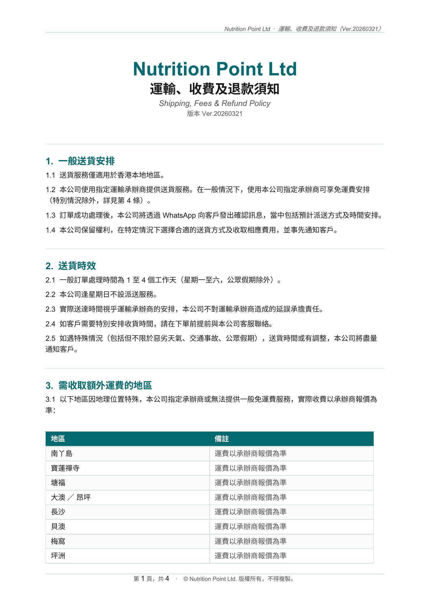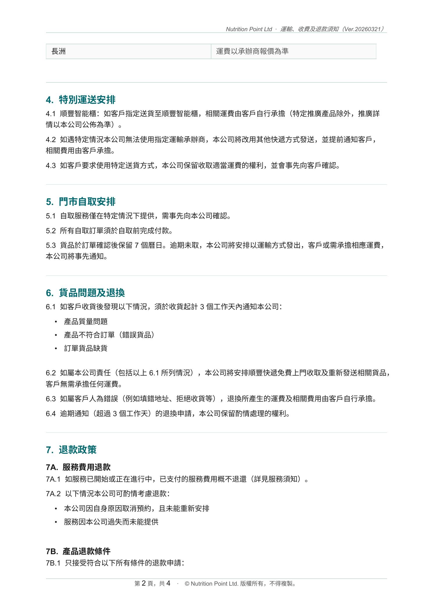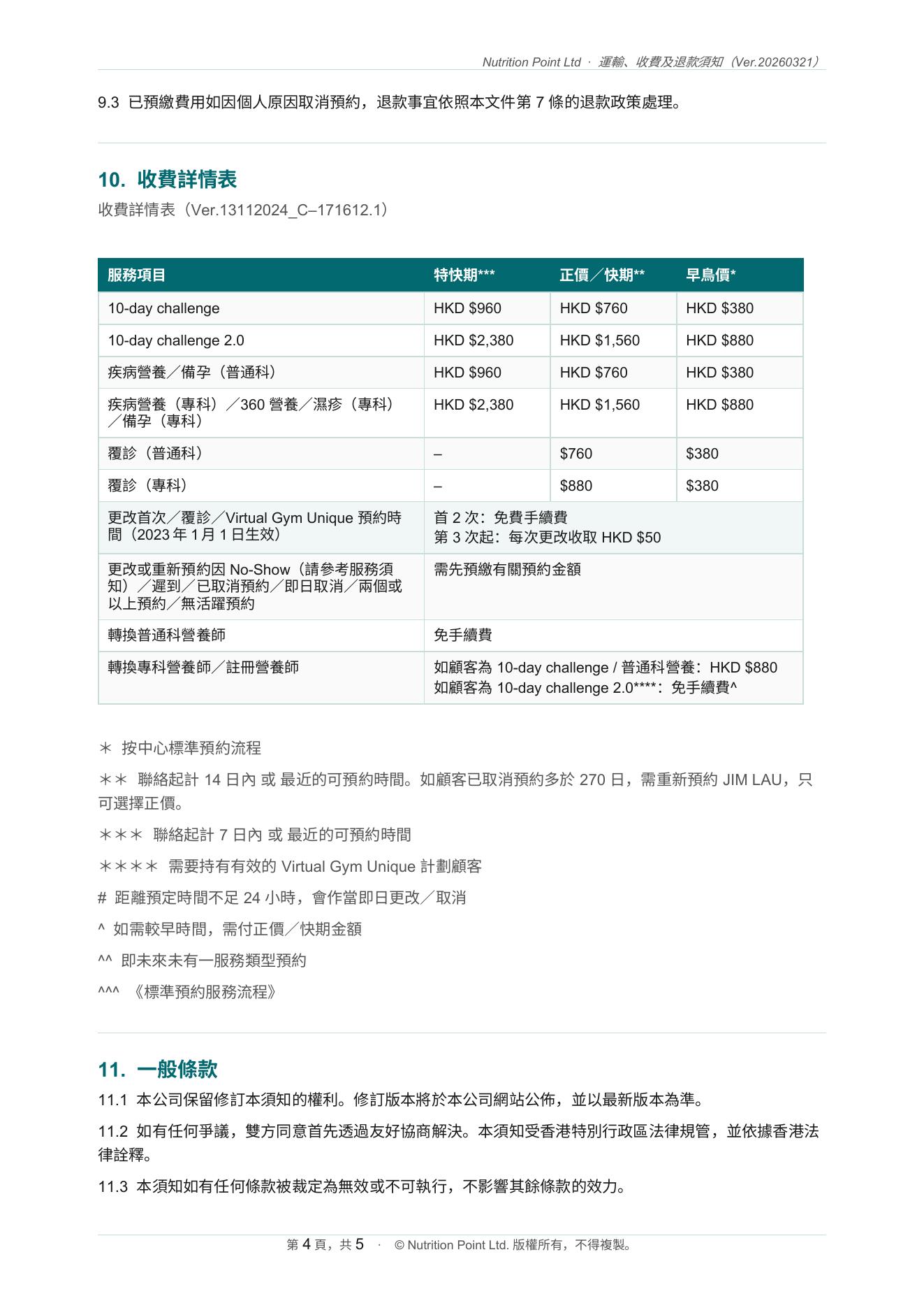 運輸、收費和退款須知
