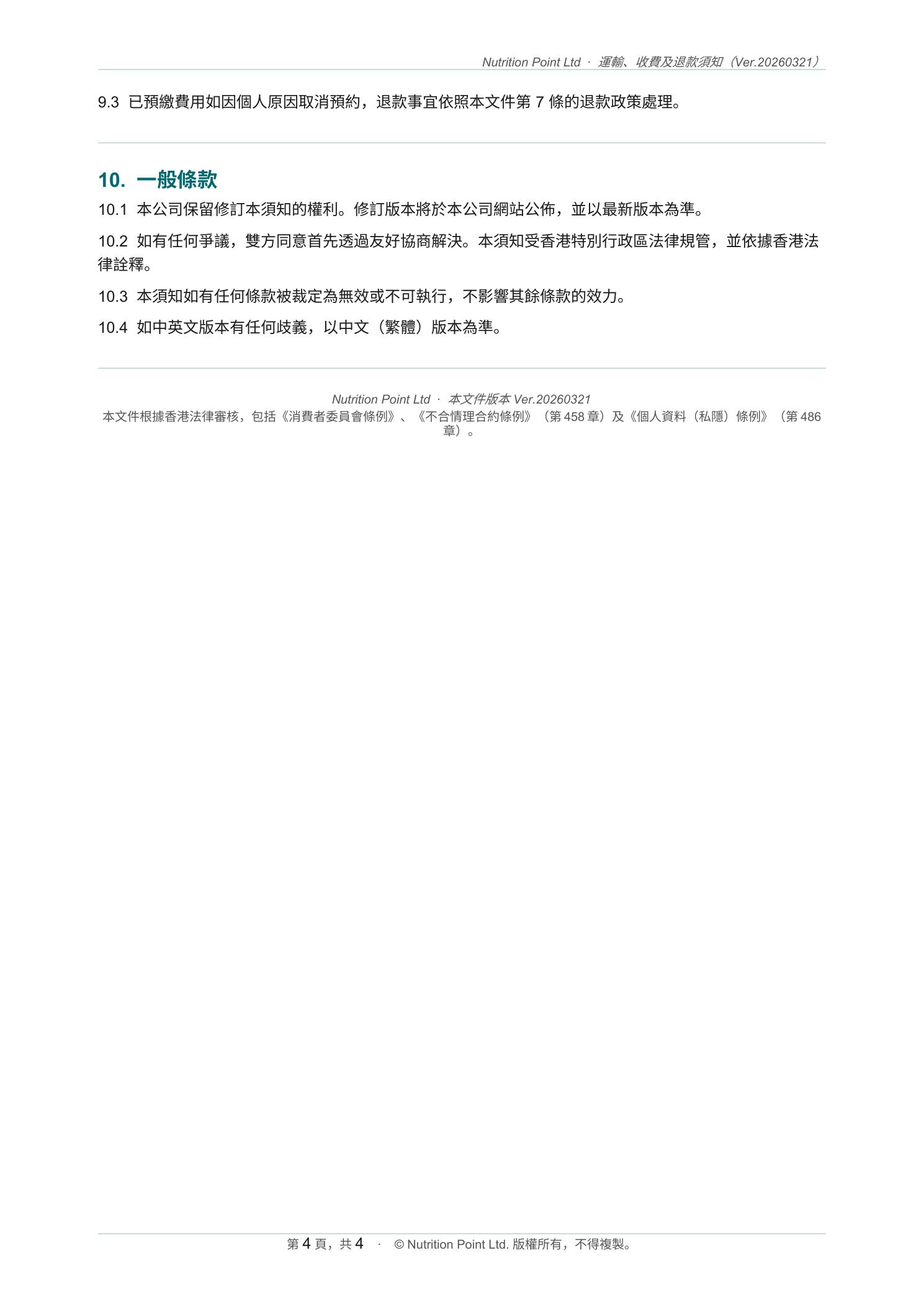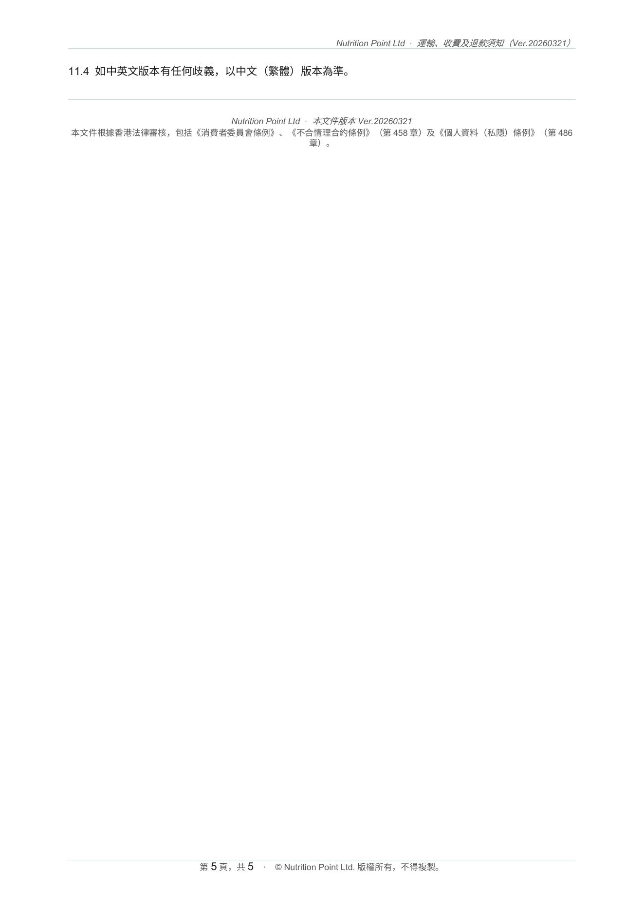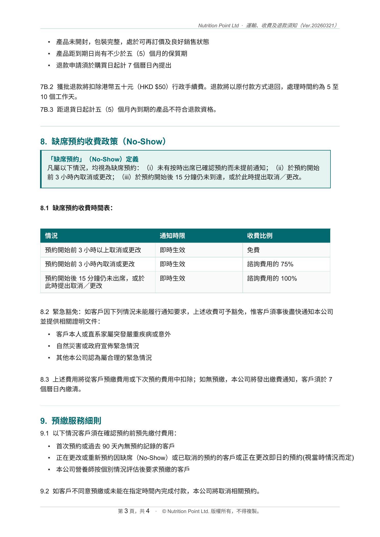 運輸、收費和退款須知