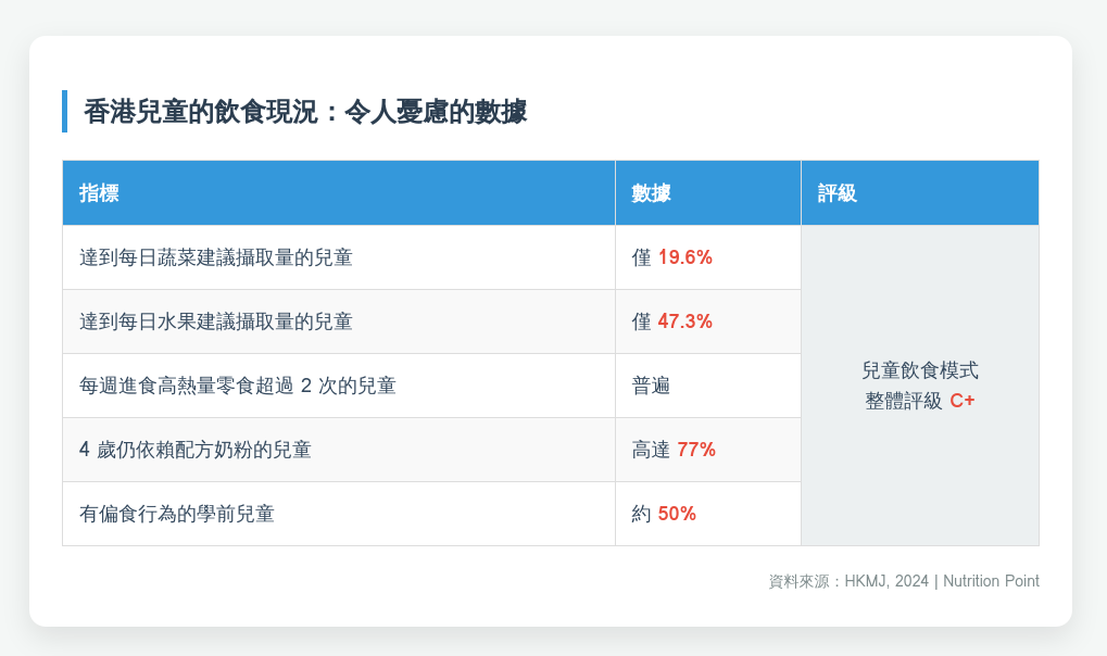 香港的情況同樣不容樂觀。根據 2024 年刊登於《Hong Kong Medical Journal》的健康飲食報告卡研究,香港學前兒童的飲食行為被評為「一般」(C 級)(HKMJ, 2024):